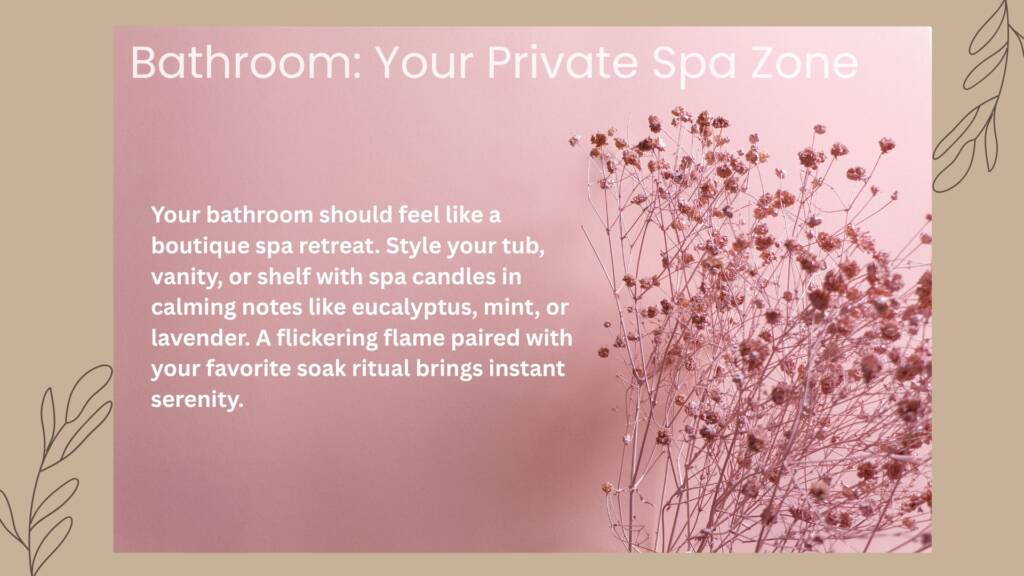 Your bathroom should feel like a boutique spa retreat. Style your tub, vanity, or shelf with spa candles in calming notes like eucalyptus, mint, or lavender. A flickering flame paired with your favorite soak ritual brings instant serenity.
