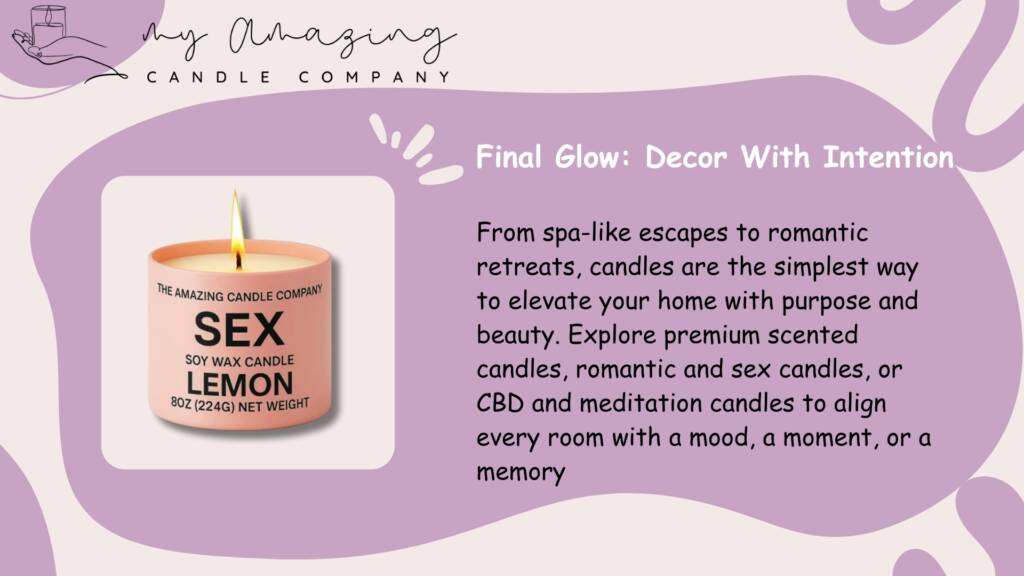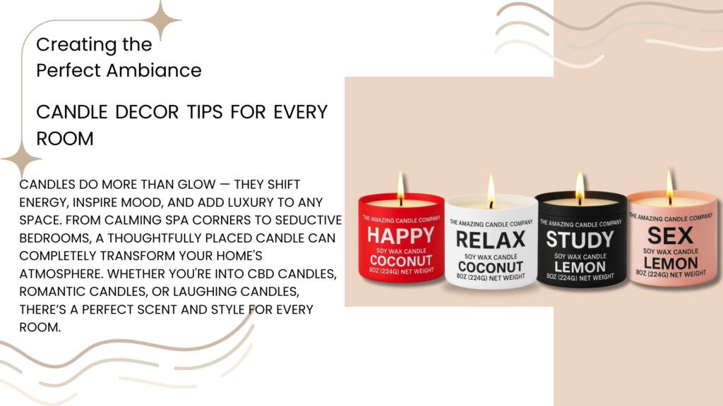 Candles do more than glow — they shift energy, inspire mood, and add luxury to any space. From calming spa corners to seductive bedrooms, a thoughtfully placed candle can completely transform your home’s atmosphere. Whether you’re into CBD candles, romantic candles, or laughing candles, there’s a perfect scent and style for every room.