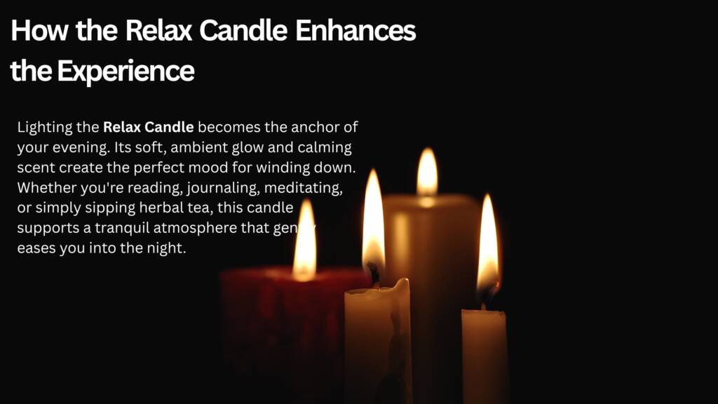 Lighting the Relax Candle becomes the anchor of your evening. Its soft, ambient glow and calming scent create the perfect mood for winding down. Whether you’re reading, journaling, meditating, or simply sipping herbal tea, this candle supports a tranquil atmosphere that gently eases you into the night.