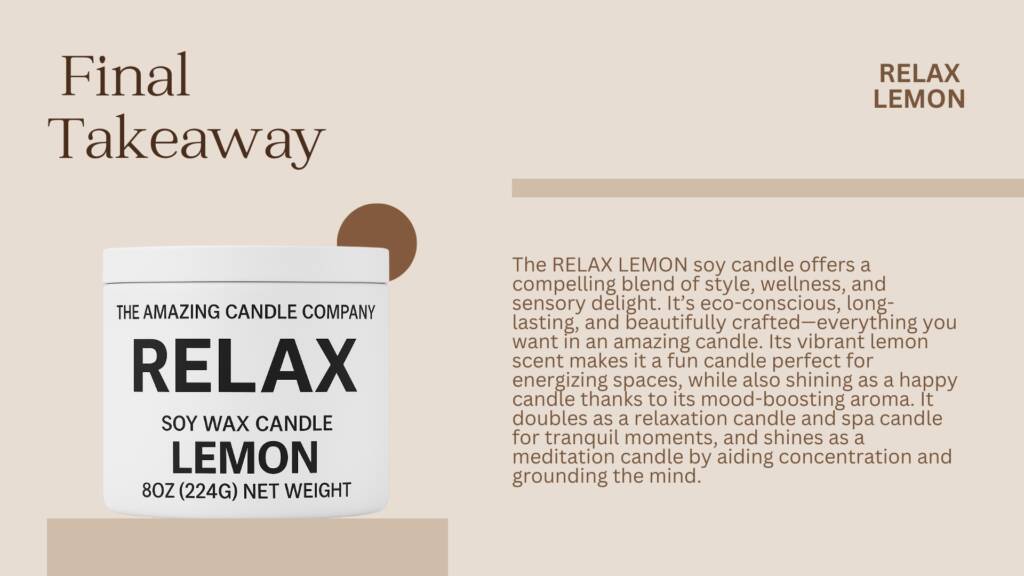 Candles do more than illuminati—they nurture mood, elevate décor, and support well-being. The beautifully minimalist RELAX LEMON soy wax candle from The Amazing Candle Company captures all of this. With its sleek white jar, bold black text, and invigorating lemon scent, it perfectly embodies a fun candle, happy candle, amazing candle, relaxation candle, spa candle, and meditation candle—all rolled into one.