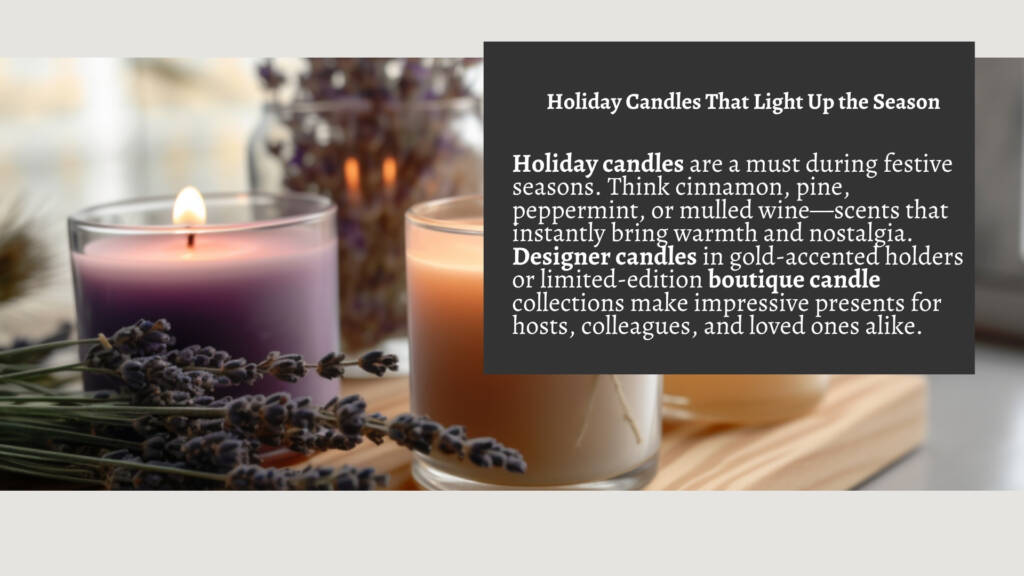 Holiday candles are a must during festive seasons. Think cinnamon, pine, peppermint, or mulled wine—scents that instantly bring warmth and nostalgia. Designer candles in gold-accented holders or limited-edition boutique candle collections make impressive presents for hosts, colleagues, and loved ones alike.
