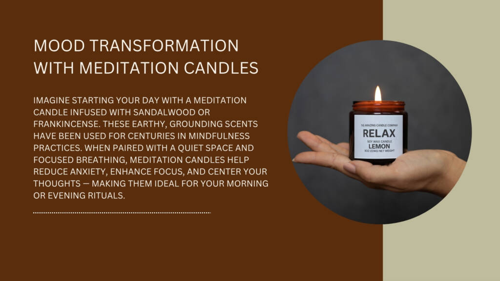 Imagine starting your day with a meditation candle infused with sandalwood or frankincense. These earthy, grounding scents have been used for centuries in mindfulness practices. When paired with a quiet space and focused breathing, meditation candles help reduce anxiety, enhance focus, and center your thoughts — making them ideal for your morning or evening rituals.